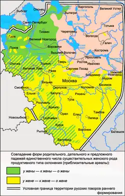 По характеру флексии родительного падежа обособленное положение занимает севернорусское наречие, в говорах которого представлено только одно окончание -и (-ы). Два окончания -и (-ы) и -е (-ê) представлены в части среднерусских и в большинстве южнорусских говоров[23]. Модель склонения существительных на -а в родительном падеже в этих говорах имеет несколько разновидностей, обусловленных как различием построения синтаксических конструкций, так и различиями в качестве согласного основы и в месте ударения. Чаще всего выбор варианта окончания -и (-ы) или -е (-ê) связан с наличием или отсутствием в конструкциях, в которых находится форма существительного, предлога (любого или какого-либо определённого). Так, окончание -е отмечается у существительных в сочетании с предлогом у, а окончание -и (-ы) — в остальных случаях (у жене́, у родне́, но без жены́, от родни́, нет жены́, нет родни́) или же -е отмечается у существительных в сочетании с любым предлогом при -и (-ы) в остальных случаях (у жене́, у родне́, без жене́, от родне́, но нет жены́, нет родни́). Употребление окончаний -и (-ы) и -е (-ê) в разных синтаксических условиях может свидетельствовать о формировании в среднерусских и южнорусских говорах двух разных падежей в соответствии родительному падежу северного наречия и литературного языка. Чёткого распределения окончаний по предложным и беспредложным конструкциям в говорах нет. В конструкциях с предлогами нередко могут использоваться оба окончания в одних и тех же формах, а в конструкциях без предлогов наряду с -и (-ы) может изредка встречаться окончание -е (ка́дка воде́, избе́ не жа́лко). В некоторых говорах критерием выбора окончания является характер основы существительного — в формах родительного падежа с основой на твёрдую согласную чаще встречается окончание -е, на мягкую — -и (-ы) безотносительно к наличию или отсутствию предлога: у сестре́, у родни́. В ряде говоров выбор окончания форм родительного падежа зависит от места ударения, окончание -е при этом выступает преимущественно в безударном положении. Нередко распределение окончаний осложняется ещё и наличием или отсутствием предлога у: окончание -е отмечается у существительных с ударением на основе с любыми предлогами: у ма́ме, от ма́ме, без ма́ме; у существительных с безударной основой это окончание отмечается только с предлогом у: у сестре́, от сестры́, без сестры́[24].