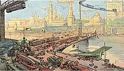 Кремль так же украшает древнюю Белокаменную и с золотыми куполами представляет феерическое зрелище. Тут же у Москворецкого моста мы видим новые огромные здания торговых предприятий, трестов, обществ, синдикатов и т. д. На фоне неба стройно скользят вагоны подвесной воздушной дороги…