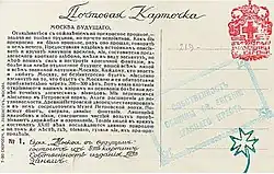 Реверс карточки № 1 с изображением Петровского парка: сопроводительный текст ко всей серии. Справа находится печать Общины святой Евгении