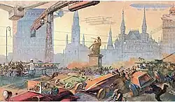 Красная площадь. Шум крыльев, звон трамваев, рожки велосипедистов, сирены автомобилей, треск моторов, крики публики. Минин и Пожарский. Тени дирижаблей. В центре — полицейский с саблей. Робкие пешеходы спасаются на лобном месте. Так будет лет через 200.