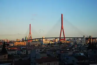 Длина мостового перехода — 8 345 м, в том числе вантовый мост 1 172 м. Мостовой переход представлен секцией двухпилонного[2] вантового моста с основным пролётом длиной 602 м и двумя эстакадными мостовыми подходами с обеих сторон. По обе стороны основного пролёта секции вантового моста расположено по два дополнительных пролёта в разных направлениях длинами по 144 (ближе к основному пролёту) и 99 м. Высота основных башенных опор вантового моста — 223 м. Башенные опоры моста имеют форму перевернутой буквы Y.