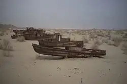 Из-за снижения уровня воды в Аральском море сегодня береговая линия находится в 100 км от Муйнака. Обнажившееся дно бывшего озера, которое за великолепные пляжи, обилие рыбы и большие размеры называли морем, теперь превратилось в пустыню.