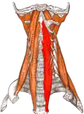 - Предпозвоночные мышцы — длинная мышца шеи (лат. m. longus colli), длинная мышца головы (лат. m. longus capitis), передняя прямая мышца головы (лат. m. rectus capitis anterior), латеральная прямая мышца головы (лат. m. rectus capitis lateralis).