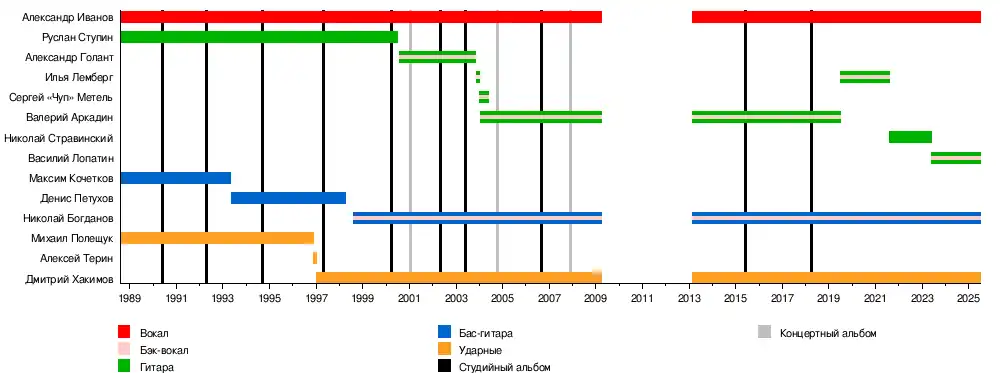 В 2019 году группу покинул гитарист Валерий Аркадин. В качестве замены в коллективе поочерёдно играли Илья Лемберг (ранее уже работавший с группой), Николай Стравинский и Василий Лопатин. Начиная с 2024 года, с группой снова гастролирует Николай Стравинский.
