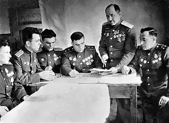 - ↑ О награждении орденами Суворова, Кутузова и Богдана Хмельницкого генералов и офицерского состава Красной Армии // Ведомости Верховного Совета Союза Советских Социалистических Республик. — 1945. — 27 июля (№ 41 (368)). — С. 1.