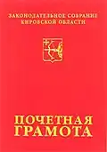 Почётная грамота Законодательного Собрания Кировской области — высшая награда законодательного органа государственной власти Кировской области, является поощрением за активную и плодотворную деятельность на благо Кировской области. Почётной грамотой награждаются граждане и организации, предприятия, учреждения независимо от организационно-правовых форм и форм собственности Российской Федерации, иностранные граждане за значительный вклад в совершенствование законодательства Кировской области, в развитие экономики Кировской области, науки, культуры, искусства, других сфер государственной и общественно значимой деятельности, за заслуги в государственном строительстве, воспитании, просвещении, охране здоровья, жизни и прав граждан, за активное участие в общественной жизни. |
