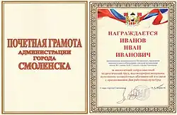 Почётная грамота Администрации Смоленской области являются формами поощрения за высокое профессиональное мастерство, многолетний добросовестный труд, достигнутые успехи в различных сферах деятельности, на благо Смоленской области и её населения. Награждение Почётной грамотой Администрации Смоленской области производится на основании распоряжения Администрации Смоленской области о награждении указанной почётной грамотой. |