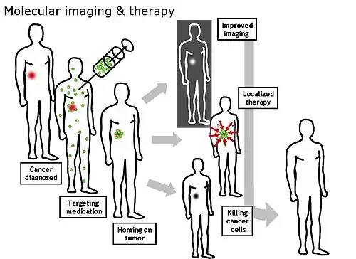 Другое наносвойство, большое отношение площади поверхности к объёму, позволяет многим функциональным группам присоединяться к наночастице, что позволяет искать и присоединяться к определённым клеткам опухолей. Вдобавок, малый размер наночастиц (от 10 до 100 нанометров) позволяет им преимущественно скапливаться в местах опухолей (поскольку в опухоли есть нехватка эффективной лимфатической дренажной системы). Отличный вопрос для исследования — как сделать эти наночастицы, используемые для съёмок, полезнее в лечении рака. Для примера, возможно ли изготовить многофункциональные наночастицы, которые будут обнаруживать, снимать, а затем и лечить опухоль? Этот вопрос активно исследуется, ответ может обозначить будущее в лечении рака.[53] Многообещающий новый способ лечения рака, который может однажды заменить радиацию и химиотерапию, приближается к клиническим испытаниям на людях. Терапия Kanzius RF присоединяет микроскопические наночастицы к раковым клеткам и затем «изжаривает» опухоли внутри тела с помощью радиоволн, которые нагревают только наночастицы и близлежащие (раковые) клетки.