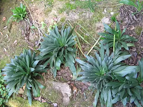 Корневище горизонтальное, древеснеющее, с одним стеблем и розеткой прикорневых листьев.
