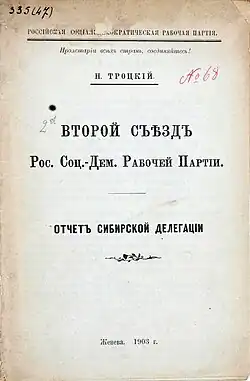 - Троцкий Н. Второй съезд Российской социал-демократической рабочей партии (Отчёт Сибирской делегации). — Женева: Изд. Российской Социал-демократической Рабочей Партии, 1903. — 36 с.