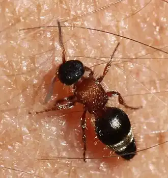 Мелкие жалящие перепончатокрылые насекомые. Длина самцов от 3 до 10 мм (самки — 3—7 мм). Самки бескрылые. Голова и брюшко чёрные, грудка и ноги рыжие (самцы могут быть полностью чёрные). Клипеус с 2 зубцами. Паразитоиды роющих одиночных ос Crabronidae и дорожных ос Pompilidae[2][3][5]. Вид был впервые описан в 1787 году датским энтомологом Иоганном Христианом Фабрицием[6].