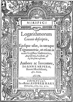 В 1614 году Непер опубликовал в Эдинбурге сочинение под названием «Описание удивительной таблицы логарифмов» (лат. Mirifici Logarithmorum Canonis Descriptio, 56 страниц текста и 90 страниц таблиц). Там было краткое описание логарифмов и их свойств, а также семизначные таблицы логарифмов синусов, косинусов и тангенсов для углов от 0° до 90°, с шагом 1′. Немного позже и независимо от Непера таблицу логарифмов опубликовал швейцарский математик Йост Бюрги, однако таблицы Непера были практичнее и удобнее в пользовании[12].