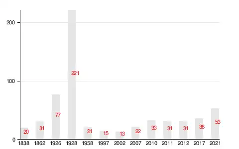 | 1862[16] | 2007[17] | 2010[18] | 2011[19] | 2012[19] | 2017[1] |