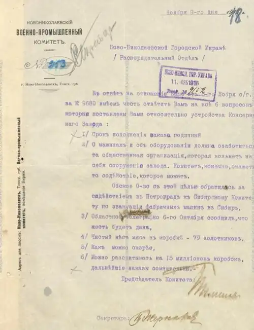 Однако в скором времени выяснилось, что Центральный ВПК решил передать заказ по поставке 10 млн коробок тушеного мяса британскому подданному М. Берглю, намеревавшемуся устроить в Новониколаевске завод, для которого уже были приобретены машины. В результате областной комитет был вынужден рекомендовать Берглю во избежания конкуренции на рынке объединиться в вопросах поставок с Новониколаевской городской думой.