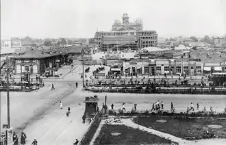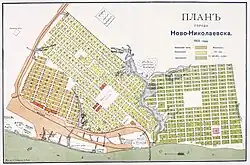 К 1914 году население города Ново-Николаевска насчитывает 60 000 человек, в 1915 году — 75 000 человек (без учёта переменного состава расквартированных войск)[40]. В городе имеются: частная и железнодорожная пристани с ледником для масла на 820 тонн, 8 религиозных учреждений (5 православных, 1 католическая, 1 старообрядческая церкви, 1 еврейская молельня), более 40 учебных заведений (в том числе реальное училище, женская гимназия, четырёхклассное городское, двуклассное железнодорожное и начальные училища), типография, 4 библиотеки, 4 больницы, амбулатории, казначейство, отделения 6 банков и 2 агентства земельных банков (обороты банков около 250 млн рублей), биржа, заводы (Военно-сухарный, чугунолитейные «Т-ва Труд» и «Верман и Петерс», кожевенные, мыловаренные, лесопильные и др.)[26].