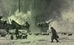 Гренландию увидели только 18 июля, прибыв 28 июля в Эгедесминде, где приняли на борт 36 эскимосских лаек, заказанных Королевской Гренландской компании. Тут же начались трудности: спущенные с поводка собаки устроили грандиозную драку, в которой трое были растерзаны сотоварищами и пожраны на месте, а двое псов сбежали[25]. В Годхавне взяли ещё 35 собак, а также 36 тонн угля[26]. Собак могло бы быть и больше, но Свердруп узнал о какой-то эпидемии и отказался от покупки. Всего собак на борту (с учётом последовавших потерь) оказалось 66[27]. Свердруп прагматически относился к собакам: для них создали режим труда и питания, чтобы постоянно поддерживать в форме, однако во время длительных санных походов ослабевшие собаки служили кормом для других тягловых животных, а иногда и для людей. Убыль собак восполнялась их естественным размножением. В рацион ездовых лаек входили через день: мясо моржей, собачьи сухари и рыба. На зимовках возводились будки, чтобы шерсть не обледеневала и не облезала. Даже когда собаки не работали в упряжке, Свердруп настаивал на их тренировке, чтобы они привыкали к соседям по упряжке и к каюру[25].