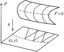 Дифференциальное соотношение задает в пространстве поле контактных плоскостей . Пересечение контактных плоскостей с плоскостями, касательными к поверхности , задает на последней поле направлений (определенное во всех точках, где контактные и касательные плоскости не совпадают друг с другом). Интегральные кривые построенного таким образом поля являются 1-графиками решений исходного уравнения, а их проекции на плоскость — графиками решений[4][5]