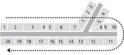 - Последовательная схема. Наиболее часто встречается в Великобритании, Ирландии, частично Германии. В разных странах может встречаться, если улица односторонняя (например у реки). Номера домов даются последовательно в порядке их расположения. Недостаток системы — номера могут пропадать (например снесли дом, дома могут перестраиваться, расширяться, сужаться…), если нумерация идет по двум сторонам улицы, то возникает сложность поиска искомого номера, особенно если вывешено мало табличек с номерами домов.