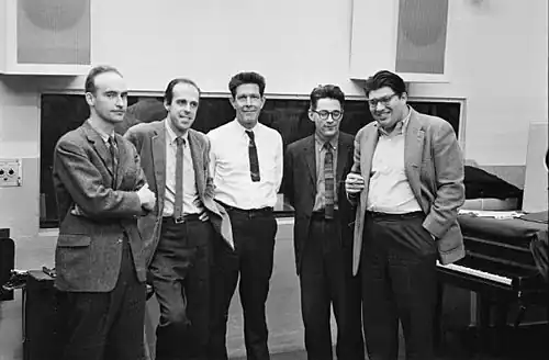 Композиторы Нью-Йоркской школы. Слева направо: Крисчен Вулф, Эрл Браун, Джон Кейдж, Дэвид Тюдор, Мортон Фелдман.