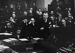 Обвинительное заключение — совместно составленное четырьмя группами, получившими в своё распоряжение массивы документов из официальных архивов нацистской Германии — состояло из 65 страниц. Американский прокурор Роберт Джексон своим собственным решением выделил «заговор нацистов» в отдельное преступление: таким образом он надеялся «удержать основную часть дела в руках американцев»[73][74]. «Зачастую бессвязный и местами неточный» документ вызвал недовольство у целого ряда его составителей, но получил высокую оценку у прессы[75][76][77]. Обвинение ввело в официальный английский язык новый термин — геноцид, предложенный в 1944 году польско-американским профессором Рафаэлем Лемкиным[78][79][80]. В последний момент советская прокуратура добавила в обвинительное заключение события в Катыни[81][14].