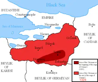 Осман I, по-видимому, умер во время многолетней осады византийской крепости Бурса в 1323—1324 годах, оставив своему наследнику Орхану значительную территорию на северо-западе Малой Азии.
