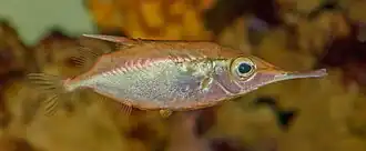 Максимальная длина тела 20 см, обычно до 12 см[2]. Окраска тела красноватого цвета, с серебристыми с золотым блеском боками и брюхом и беловатыми плавниками. Отличается вытянутой в длинную трубку головой, костяными полосками по бокам спины и на краях груди и брюха, отсутствием боковой линии, двумя спинными плавниками, из которых первый короткий, колючий, с не вполне развитыми брюшными плавниками на брюхе. Тело сжатое с боков с мелкими шероховатыми чешуями, зубов нет, один из лучей первого спинного плавника сильно развит. 2-й луч первого спинного плавника очень велик и сзади зазубрен.