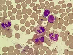 - цитоплазма лимфоцитов и моноцитов принимают сине-голубую окраску[1].