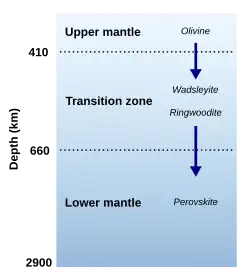 Согласно современным представлениям геофизики, верхняя мантия составлена преимущественно из перидотитов, большей частью — оливина, пироксенов (клинопироксена и ортопироксена) и глинозёмистых минералов в переменных пропорциях. В самой верхней части мантии глинозёмистая фаза представляет собой плагиоклаз, ниже — шпинель и шпинелиды, а затем, ниже глубины в 100 км — гранатиты.[4]