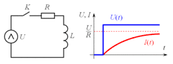 На рисунке изображена коммутируемая RL-цепочка. В некоторый момент времени t=0 ключ К замыкается. Определить зависимость тока в RL-цепочке от времени.