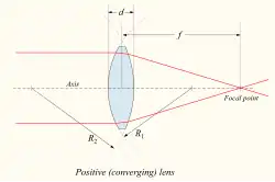 Оптический элемент, создающий сходящиеся или расходящиеся световые пучки света из-за преломления, называется линза. Основной параметр линзы — фокусное расстояние. Принято считать, что собирающая линза имеет положительное фокусное расстояние, а рассеивающая линза — отрицательное фокусное расстояние. Меньшее фокусное расстояние означает, что линза более сильно собирает или рассеивает пучок света. Фокусное расстояние простой линзы в воздухе определяется формулой линзы[42].