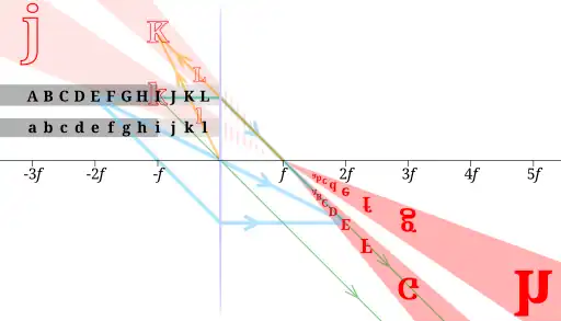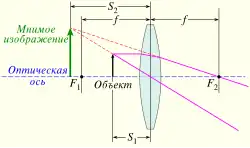 В случае рассеивающих линз приходящие параллельные лучи расходятся после прохождения через линзу таким образом, что кажется, что они исходят из точки на расстоянии одного фокусного расстояния перед линзой. Эта точка называется передней фокусной точкой линзы. Лучи от объекта, расположенного на конечном расстоянии, связаны с мнимым изображением, которое находится ближе к линзе, чем точка фокусировки, и на той же стороне линзы, что и объект. Чем ближе объект к линзе, тем ближе мнимое изображение к ней. Как и в случае с зеркалами, вертикальные изображения, создаваемые одной линзой, являются мнимыми, а перевёрнутые изображения — реальными[40].