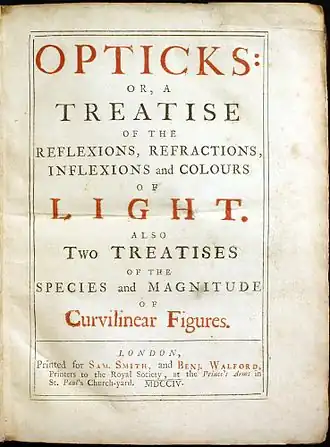 Оптическая теория развивалась в середине XVII века с появлением трактатов, написанных философом Рене Декартом, в котором объяснялось множество оптических явлений, включая отражение и преломление, предполагая, что свет излучается объектами, которые его создали[27]. Это существенно отличалось от древнегреческой теории излучения. В конце 1660-х — начале 1670-х годов Исаак Ньютон расширил идеи Декарта до корпускулярной теории света, определив, что белый свет представляет собой смесь цветов, которые можно разделить на составные части с помощью призмы. В 1690 году Христиан Гюйгенс предложил волновую теорию света, основанную на предположениях Роберта Гука в 1664 году. Сам Гук публично критиковал теории света Ньютона, и вражда между ними длилась до самой смерти Гука. В 1704 году Ньютон опубликовал «Оптику», и в то время, отчасти из-за его успехов в других областях физики, он, как правило, считался победителем в дебатах о природе света.