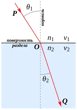 - где и — углы между нормалью (к границе раздела) и падающим и преломленным лучами соответственно[40].