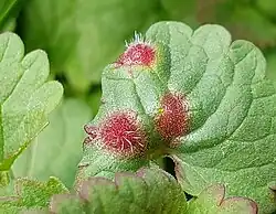 На ранних стадиях развития галл выглядит как небольшие красные пятна на листьях. Покраснение обусловлено накоплением пигментов антоцианов. Со временем галл разрастается, за счёт химически-индуцированной пролиферации клеток, и достигает размера крупной горошины. Галл имеет одну камеру выстланную питательной тканью с личинкой внутри[3]. При росте несколько близко расположенных галлов могут срастаться[4]. Эпидерма галла имеет хорошо развитые трихомы[5].