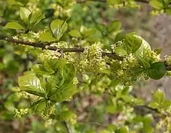 Двудомный вид. Однополые цветки развиваются в апреле — мае, женские цветки одиночные, а мужские — в небольших соцветиях. Все цветки зеленоватого цвета и имеют четыре зубца. Четыре яйцевидных чашелистика сросшиеся у основания. Четыре эллиптических и крышевидных лепестка имеют длину всего 3 мм. В мужских цветках имеется только один круг с четырьмя тычинками. В женских цветках четыре карпеля свободны. Короткие стилеты частично сросшиеся и заканчиваются четырьмя рыльцевыми ветвями.
