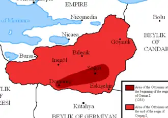 Осман покорил Биледжик, Ярхисар, Инегёль, Енишехир и окрестности этих городов. Ашикпашазаде датирует захват первых трёх 1299 годом, Орудж и Анонимная хроника — на десятилетие раньше[47]. Обстоятельства захвата описываются Ашикпашазаде так: отец девушки был владельцем крепости и собирался выдать её замуж за владетеля другого города-крепости[48]. Опасаясь объединения их сил, Осман во время свадебного торжества совершил набег и захватил обе крепости. Девушка была взята в плен и выдана замуж за Орхана. В качестве этих крепостей называют Ярхисар и Биледжик[49]. Сразу быстрым набегом был захвачен и Инегёль[40]