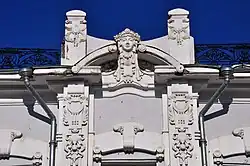 Фасад здания украшен лепниной в стиле модерн. Стилизованный растительный орнамент украшает углы окон первого этажа, свод проезда и верх стен южного ризалита. Узор из плодов, листьев и лент помещён в верхах пилястр центрального ризалита и на кронштейнах карниза. Сложный лепной орнамент покрывает фронтоны ризалитов и аттик. Балконы и парапет крыши имеют ажурную металлическую ограду сложного модернового рисунка[7].