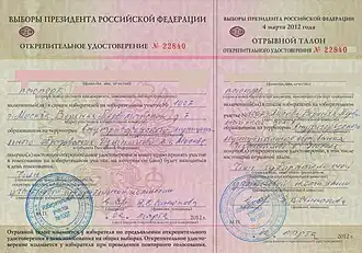 - ↑ Федеральный закон об основных гарантиях избирательных прав и права на участие в референдуме граждан Российской Федерации. Статья 62: Открепительное удостоверение. Дата обращения: 24 ноября 2011. Архивировано 28 сентября 2011 года.