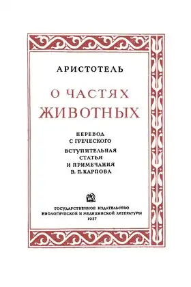 - Аристотель. О частях животных. / Пер. В. П. Карпова. (Серия «Классики биологии и медицины»). М.: Биомедгиз, 1937.