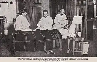 ![]() Л. В. Падлевский в период выздоровления в лазарете противочумной лаборатории форта «Александр I» (1907) | |