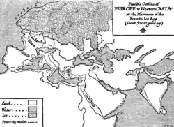 Северная Европа во время оледенения была закрыта ледником Фенно-Скандии, который достигал Британских островов на западе и среднего Поволжья на востоке. Ледники покрывали арктический шельф Сибири, омывающие её моря, все Альпы и многие горы Азии. Во время пика последнего оледенения, около 20 тыс. лет назад, существовавший в то время перешеек, соединяющий Азию и Америку, который носит название Берингия, также был покрыт ледником[14], что затрудняло проникновение человека в Северную Америку. Последняя, кроме того, была блокирована ледниками не только на севере Канады, но и на большей части Кордильер. В Южной Америке льды, наступающие из Антарктиды и спускающиеся с Анд, достигали равнин Патагонии. Льдами были покрыты Тасмания и Новая Зеландия. Даже в Африке ледники покрывали горы Кении, Эфиопии, Килиманджаро, Атлас и другие горные системы.