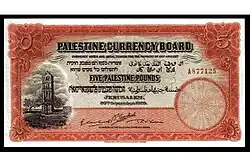 Реверс: Гильошированная виньетка; изображение Башни Давида; текст «Пять палестинских фунтов (Земли Израильской)» на иврите, «Пять палестинских фунтов» на английском и арабском языках; цифра «5» в современном начертании и традиционном арабском.