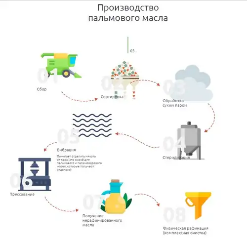 Современная технология производства пальмового масла включает в себя следующие стадии:
