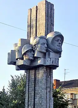 Стела с изображёнными в профиль лицами красноармейца, рабочего, колхозницы, солдата и космонавта. | Комсомольская площадь |