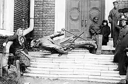 | Сергей Пец, проект постамента памятника Петру Великому, 1909 | Торжественное открытие памятника, 27 июня 1914 | Опрокинутая статуя, 1920 год | Банкнота РФ в 500 рублей | 2010 год |