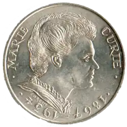 | 1984 | Серебро | 15 г | 31 мм | 1984 | рубчатый | Номинал | Портрет Марии Кюри | Париж | ![]() |