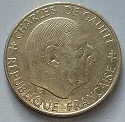 | 1988 | Никель | 6 г | 24 мм | 1988 | рубчатый | Номинал | Портрет Шарля де Голля | Париж | |||