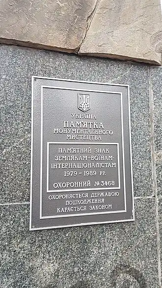 Решением исполкома Черниговского областного совета народных депутатов от 30.08.1991 № 193 присвоен статус памятник монументального искусства местного значения с охранным № 3468 под названием Памятный знак землякам — воинам-интернационалистам.