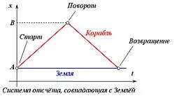 Наглядно это можно увидеть на рис. 1 и 2, где показана одна и та же ситуация с разных точек зрения. На рис. 1 рассматривается инерциальная система отсчёта, связанная с Землёй. Рис. 2 показывает инерциальную систему отсчёта, связанную с кораблём. Однако поскольку корабль не всё время движется равномерно (условно считаем, что его путь состоит из двух участков равномерного движения, разделёнными кратковременным ускорением), то инерциальная система отсчёта может совпадать с кораблём только часть его пути. Рассматриваем систему, которая совпадает с кораблём на первой половине его путешествия.
