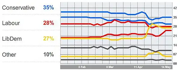 На 2 мая 2010 г. Консервативная партия оказалась на первом месте по рейтингу (её поддержали 37% населения), на 2 месте оказались Лейбористская и Либерально-Демократическая партии, за поддержку которых выступили 27% населения. Остальные партии получили 7% голосов[2].